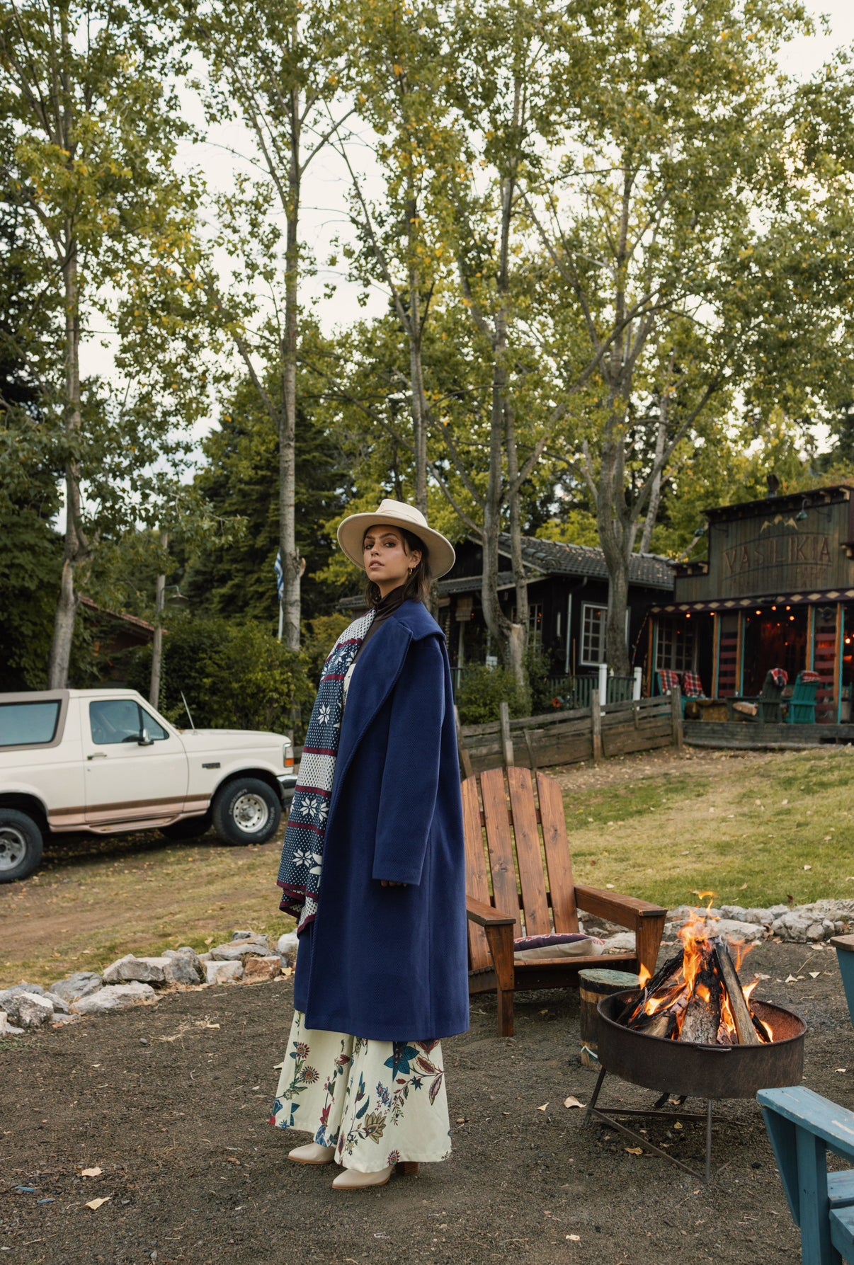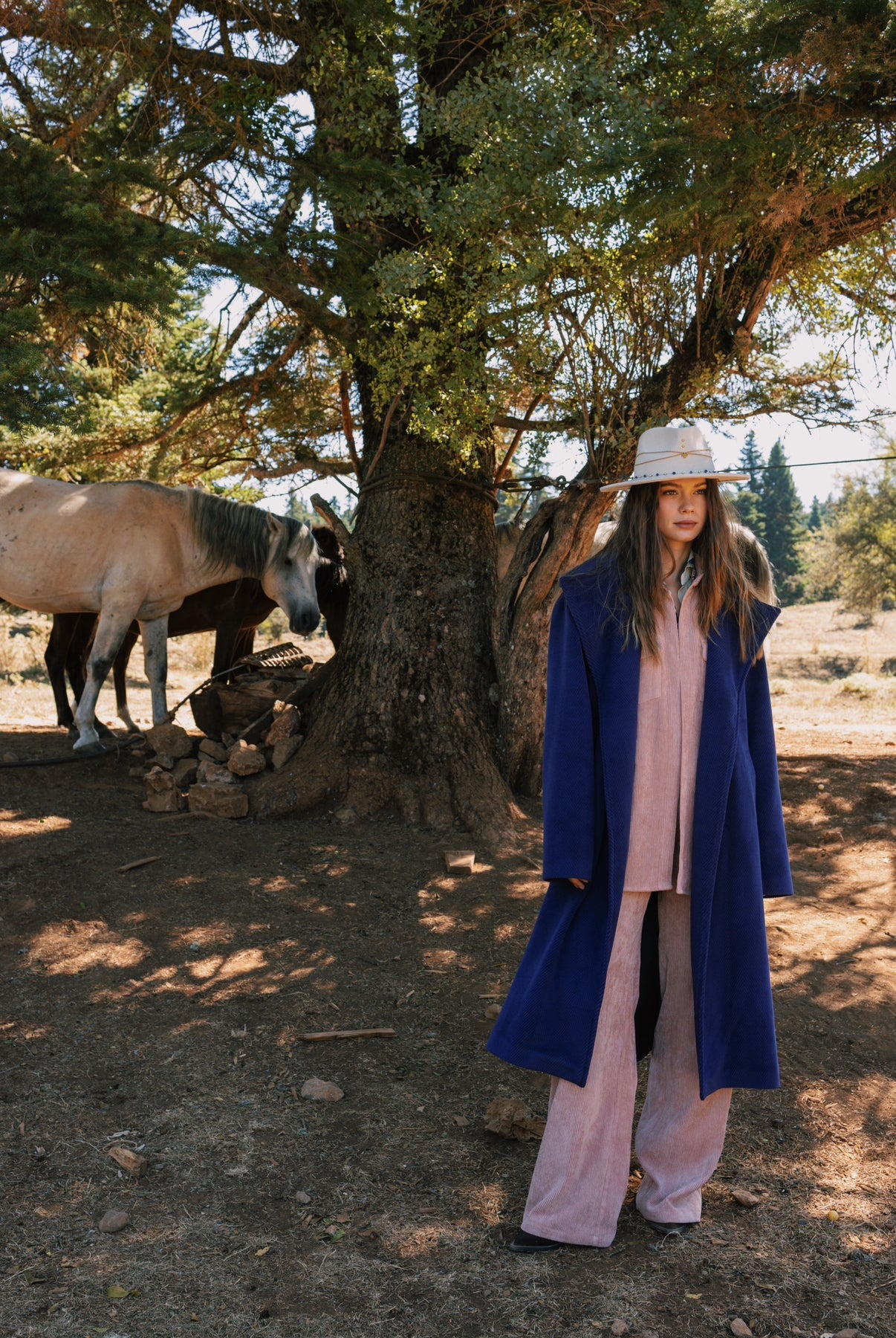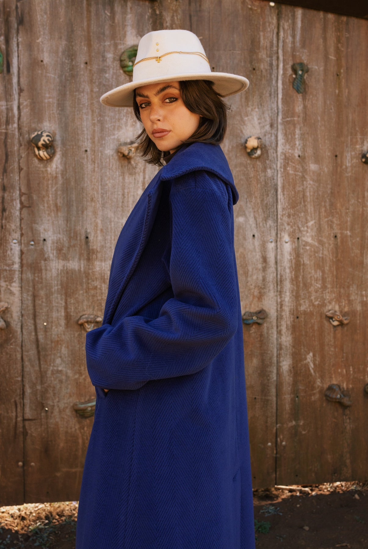 - Μακρύ μπλε παλτό με γιακά πέτο.