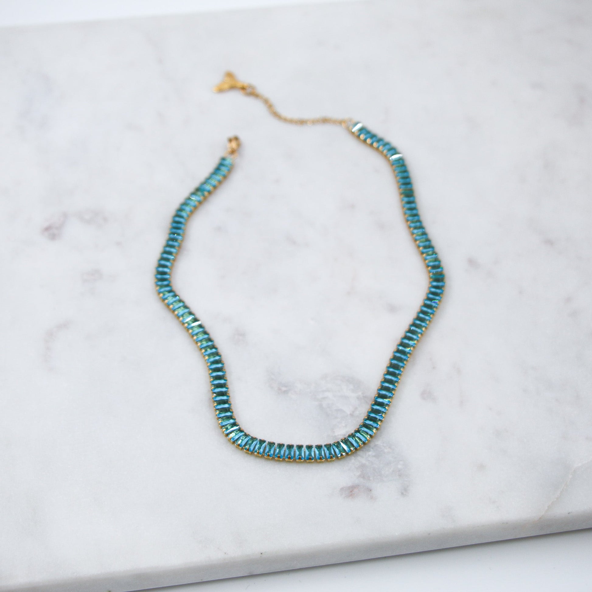- Κολιέ ατσάλινο επιχρυσωμένο με γαλάζια ζιργκόν.
