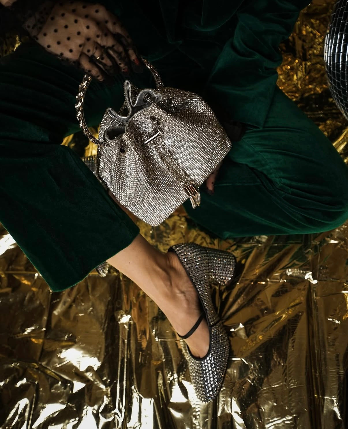 Σύνθεση: Ασημί τσάντα με κρύσταλλο στρας.